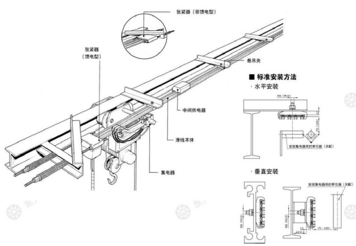3. 在集電器安裝過程中(指JDS型集電器),若不易確定安裝尺寸時,可使集電器橫桿與滑線保持平行達到安裝要求。